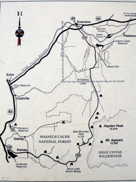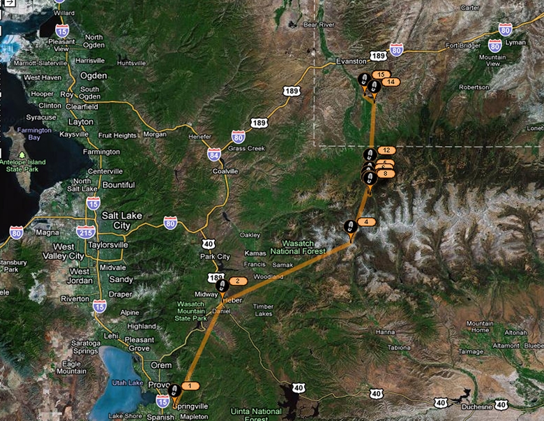 To the east is the North Slope Road leading to the area of the backpack. The tracking line from the North is from the Wyoming area of Bear River Town following the Mirror Lake Scenic Byway that traverses the western end of the High Uintas and continues down to Kamas, and then to Francis where it ends.