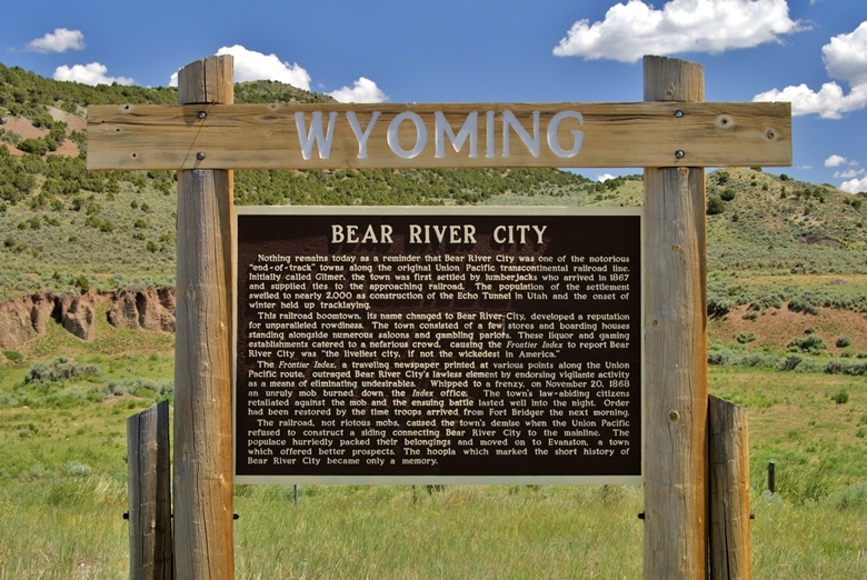 We are heading north towards Evanston, Wyoming driving through wonderful ranching country. Our objective is to learn more about what became known to many as Beartown. About 10 miles from Evanston there is a tourist historical turn-out that everyone should take a moment to see. The part I was interested in was: