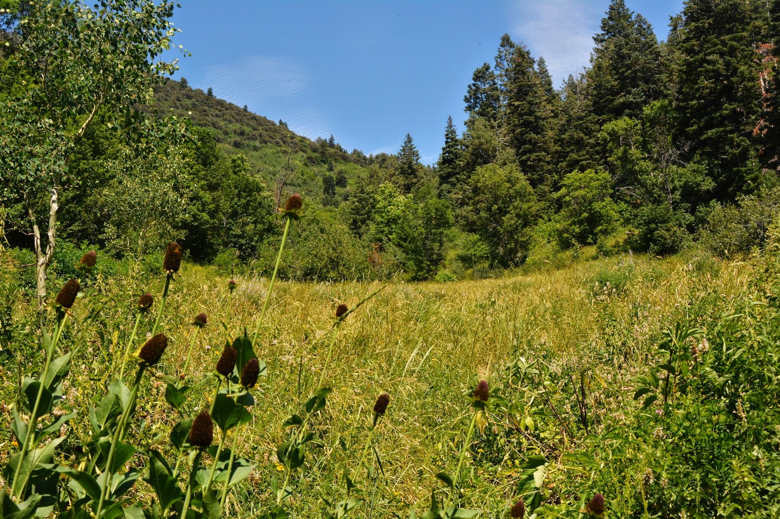 I got a good stick  (I needed a machete) and began  beating my way up through the stinging nettle and  over a little rise that took me to the big meadow, now on the dry, southern portion of the Flats.