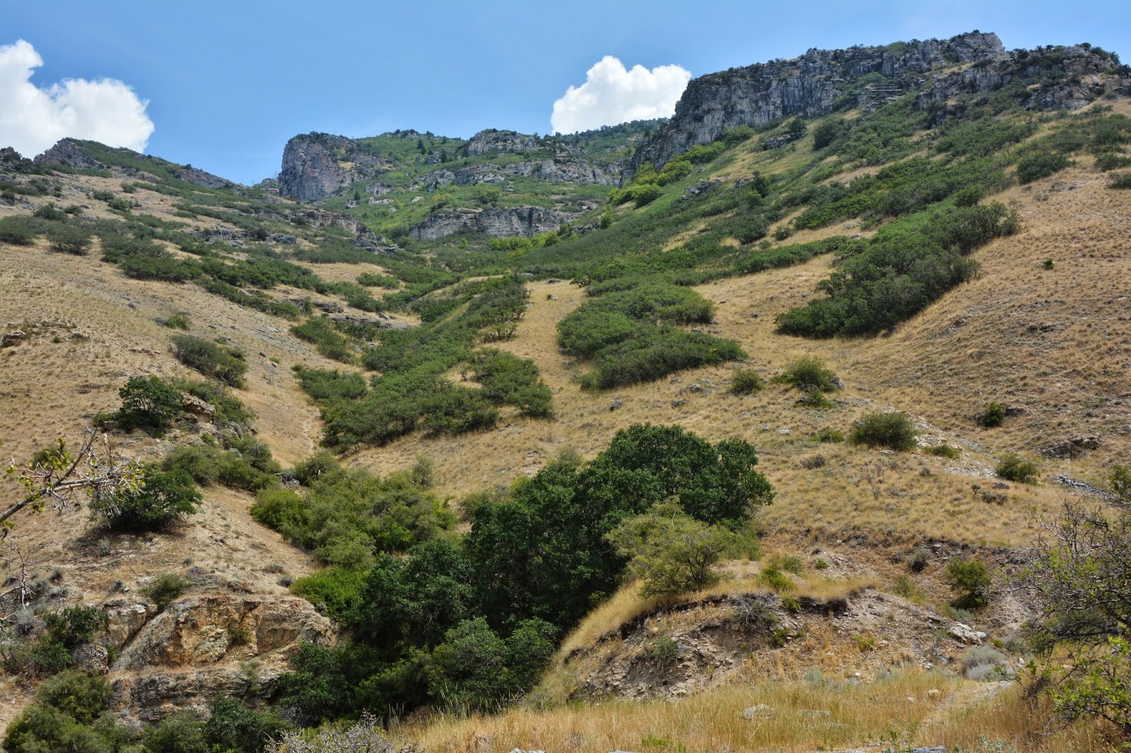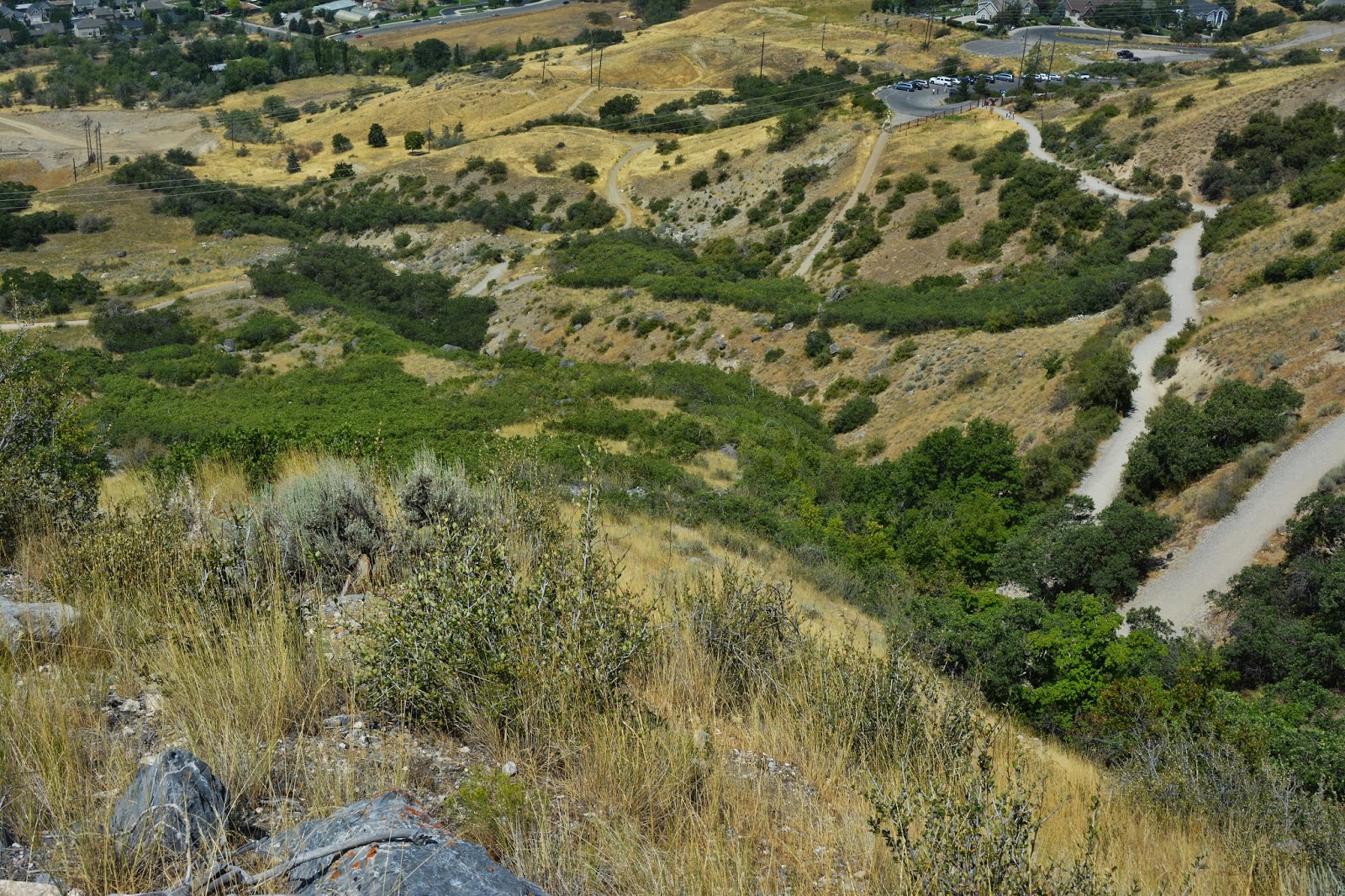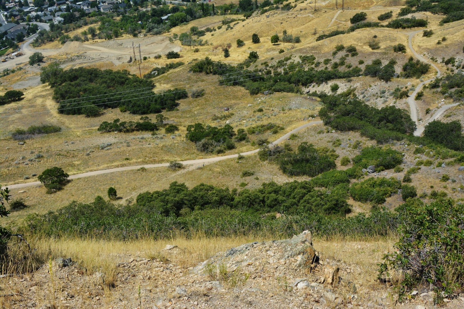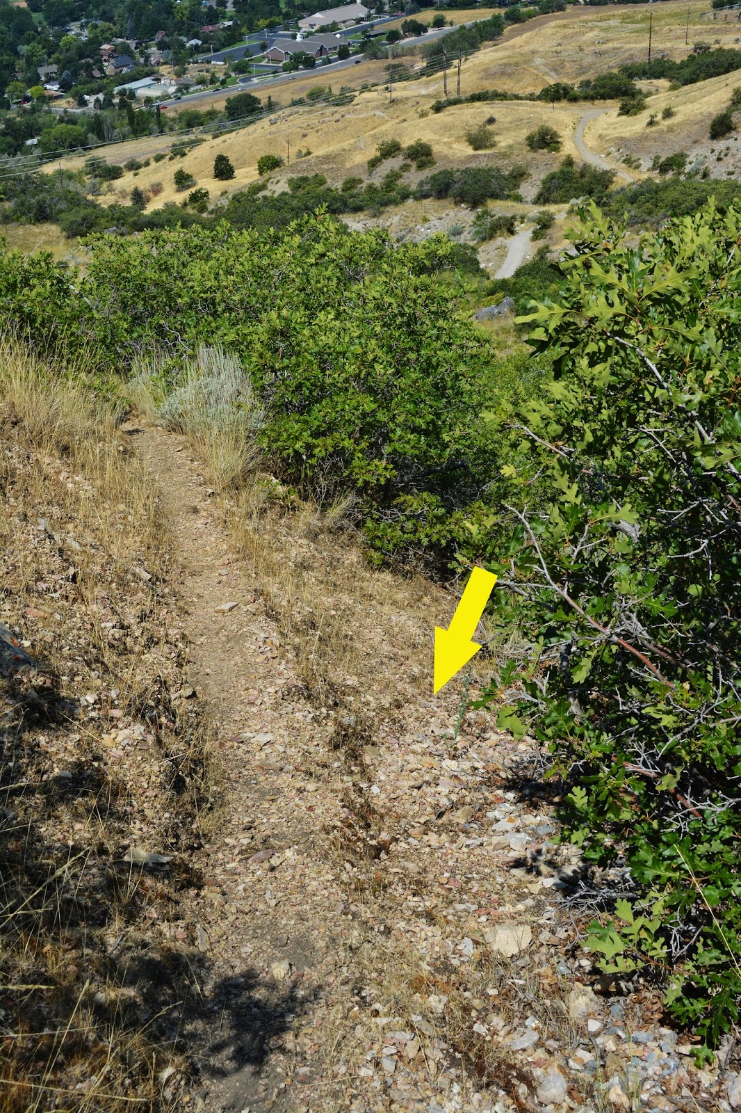 To keep us oriented as to where we are I’ll take photos from each spot looking back down, seeing here the eastern edge of Provo.  From this point the pathway goes straight down and seems to end at the foothill road, which the  Bonneville Shoreline Trail follows.