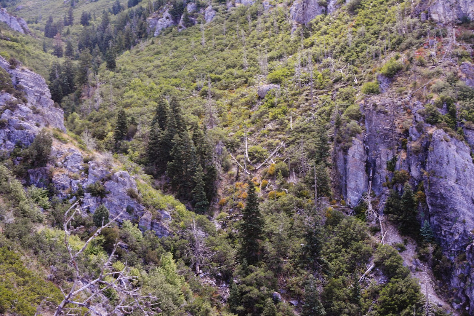 At the 1st turn on the Y-Trail we look across at the timber slide pathway coming down Slide Canyon