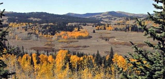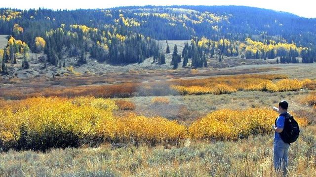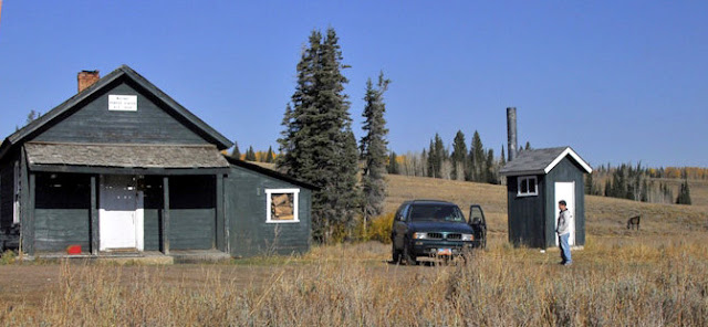 About 4 miles from the highway we begin winding our way down into the drainage of the West Fork of the Bear River, and in this shot see in the dead center a ranger station where we would park. .